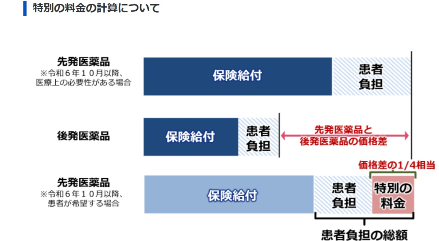 令和6年10月より医薬品のしくみが変わり、後発医薬品(ジェネリック医薬品)があるお薬で、先発医薬品の処方を希望された場合、特別な料金を受診者が負担することになりました。