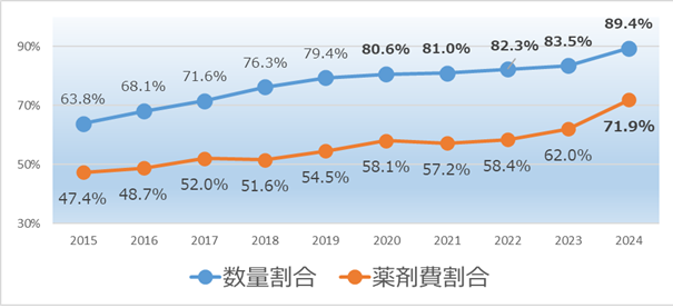 国の目標値(数量割合:『80%』、薬剤費割合:『65%』)に対し、加入者の皆様のご協力もあり、2020年度以降数量割合は目標値をクリアし、薬剤費割合も2024年目標値をクリアできています。今後も維持・向上できるよう、対象の方々への通知は今後も継続します。